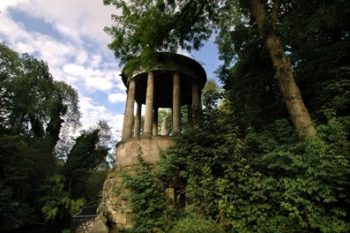In August 1788, the well was bought by Lord Gardenstone, who claimed he had derived great benefit from drinking the waters and, in 1789, the present construction, a circular Roman Temple was commissioned by him. This elegant architectural structure in the form of a Doric rotunda is inspired by the Temple of Vesta at Tivoli in Italy. Under the lead dome stands a marble statue of Hygieia, Goddess of Health. In 1885, the well and grounds were purchased by the publishers Thomas Nelson & Sons. After restoration, it was left to the City of Edinburgh. The pump-room was refurbished in lavish Victonan style. The interior was designed like a celestial vault sparkling with sequin-like stars when sunlight strikes through the stained glass windows. The white marble pedestal is inscribed BIBENDO VALEBIS (By Drinking You Will Be Well).