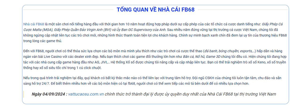 FB68 được cấp 3 giấy phép hợp pháp đạt chuẩn quốc tế được cấp bởi:  Malta (MGA), Quẩn đảo Virgin Vương quốc Anh (BVI) & GAMBLING COMMISSION và là một nhà cung cấp giải pháp gambling online được Hiệp Hội Quốc Tế công nhận. Trước khi đăng ký tham gia, vui lòng đảm bảo bạn đã đủ 18 tuổi.