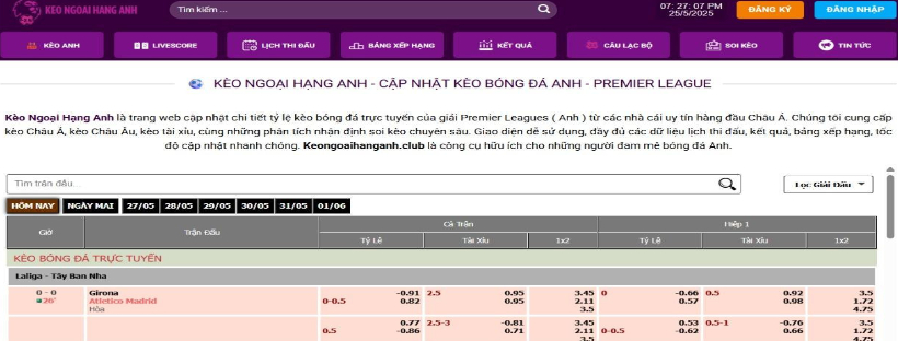 Kèo Ngoại Hạng Anh nơi cung cấp các dữ liệu kèo bóng đá Anh mới nhất và chuẩn xác. Xem chi tiết bảng kèo nhà cái Premier Leagues tại đây.