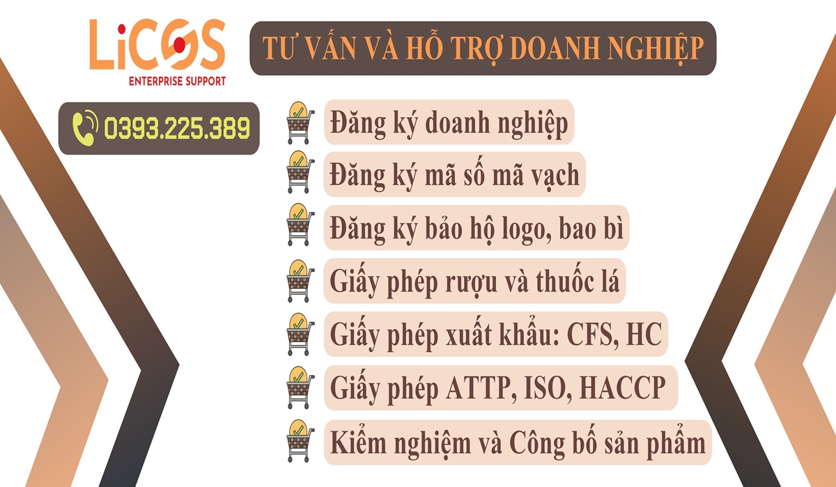 LiCOS là đơn vị chuyên tư vấn giấy phép: đăng ký kinh doanh, công bố sản phẩm, đăng ký bảo hộ thương hiệu, cấp giấy chứng nhận an toàn thực phẩm, giấy phép xuất khẩu thực phẩm,…