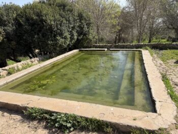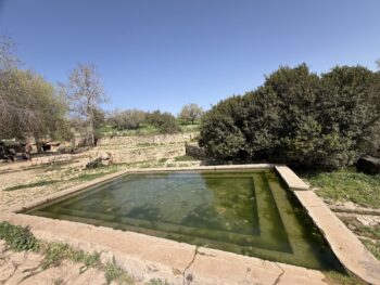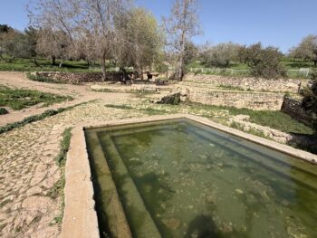 This is a spring which has been in use since the 1st century BCE and it is surrounded by a bathhouse a pool and archeological artefacts from the Roman era and located in the park of Ramat Hanadiv. And has clean drinking water. Near Ceasaria.