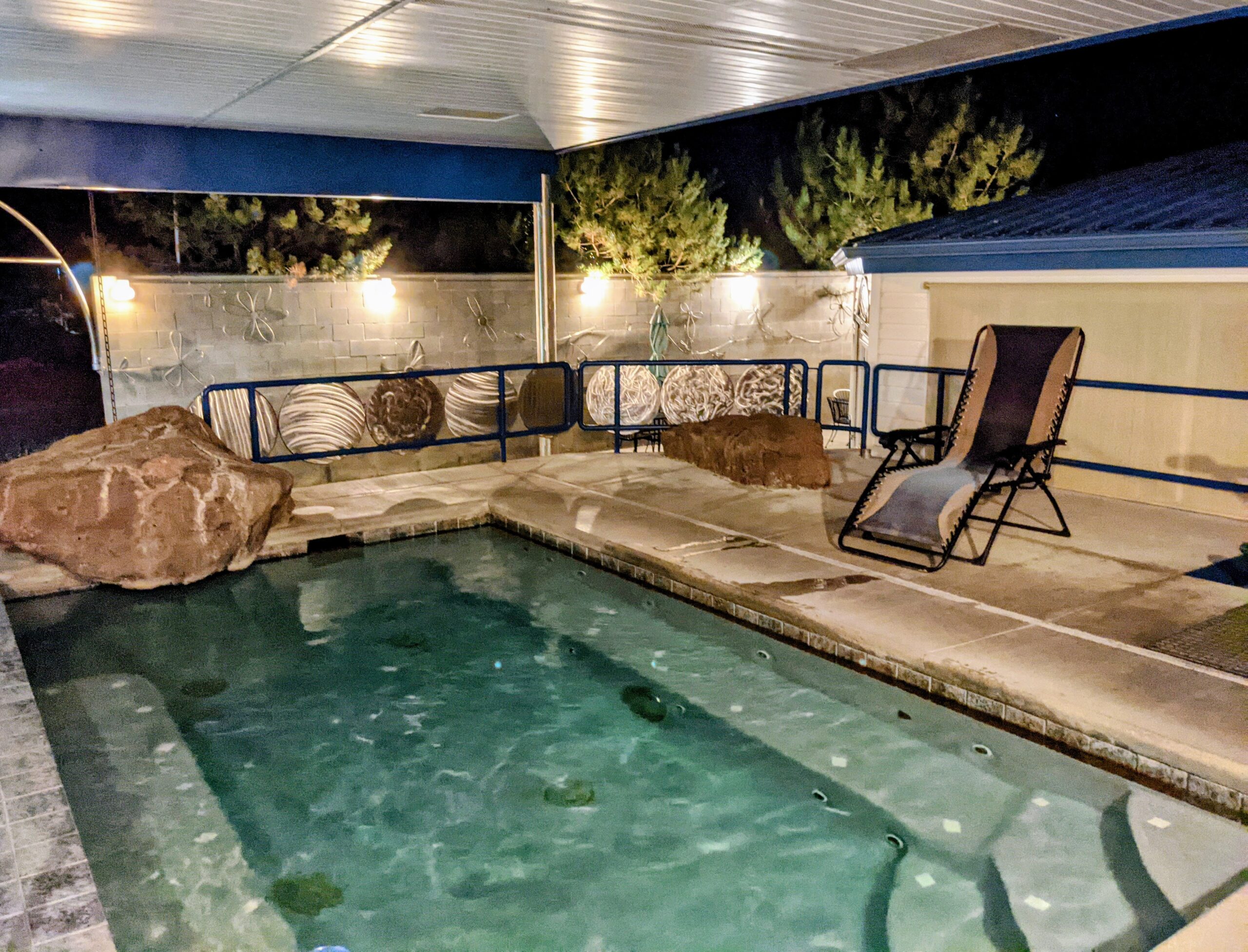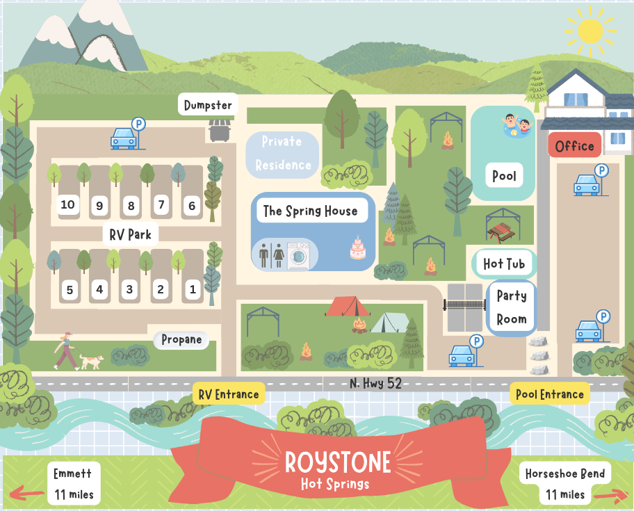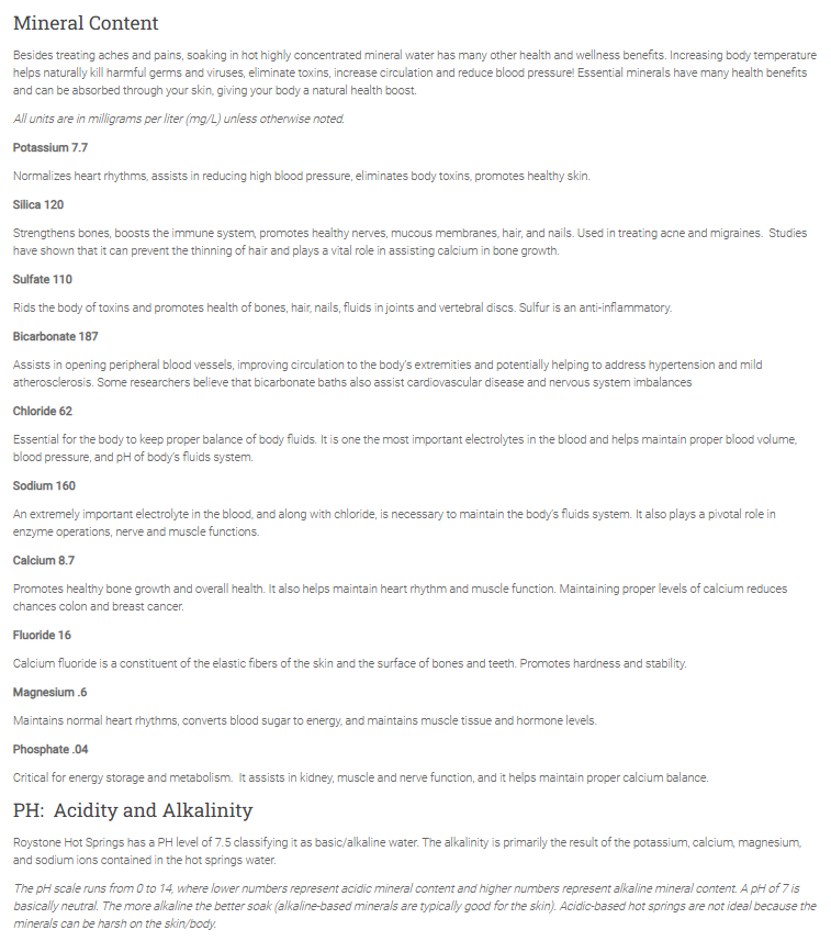Roystone offers a reservable hot spring pool as well as a smaller hot tub style spring. Other activities such as camping, and RVing are offered as well. The main pool is described as a cozy 98 degrees F though it is cooled in the summer for all season soaking. This bigger pool offers activities such as water basketball, radio, and other swimming toys which makes it perfect for a family soak. If looking for something a little more relaxed, there is a smaller hot tub spring which sits at a 104 degrees F. This tub has a projector for any movie streaming.